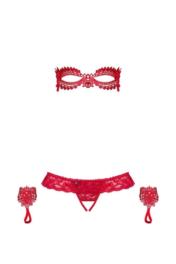 Komplet w kolorze intensywnej czerwieni. Maska na oczy z gipiury, na elastycznej gumce, rękawiczki z oczkiem na palec. Stringi z koronki, z otwartym krokiem.