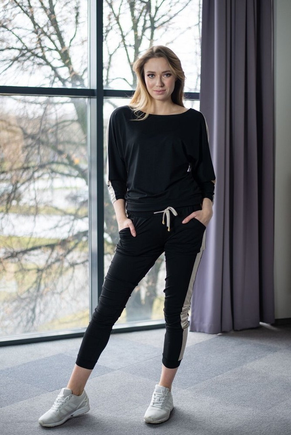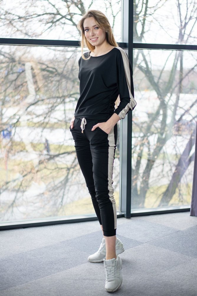 Komplet dresowy wykonany z wysokiej jakości dzianiny. Bluza i spodnie zostały wykończone błyszczącymi lampasami oraz troczkiem co nadaje niecodzienny charakter pozornie zwykłemu dresowi. Marszczenie na boku bluzy pozwoli użytkować komplet w trakcie ciąży ponieważ pomieści ona ciążowy brzuszek.Chcesz poczuć się modnie i stylowo? Jest to komplet dla Ciebie.