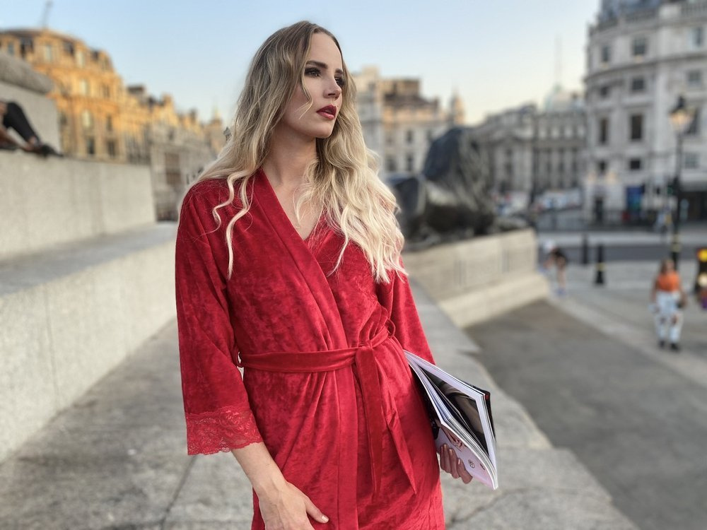 Halat de damă din catifea de bambus de înaltă calitate. Scurt, legat în talie, mânecă 3/4. Manșetele sunt decorate cu dantelă florală uimitoare. Halatul de baie se adaptează perfect la forma corpului, este extrem de moale și ușor. Să te înfășori în el după baie este o plăcere!