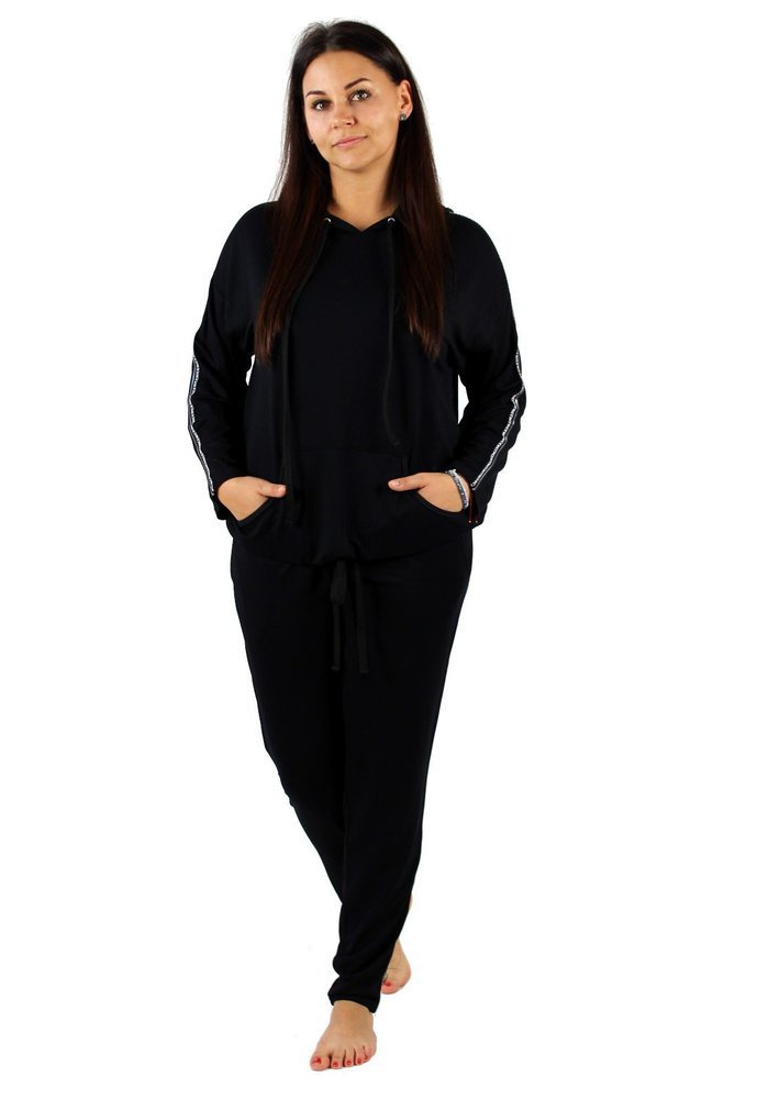 Trening confortabil pentru femei din material prietenos cu corpul. Hanorac cu glugă și mâneci lungi. La nivel abdominal, buzunar. Pantaloni cu buzunare. Cureaua se încheie cu un cordon. Mâneci și picioare împodobite cu litere.