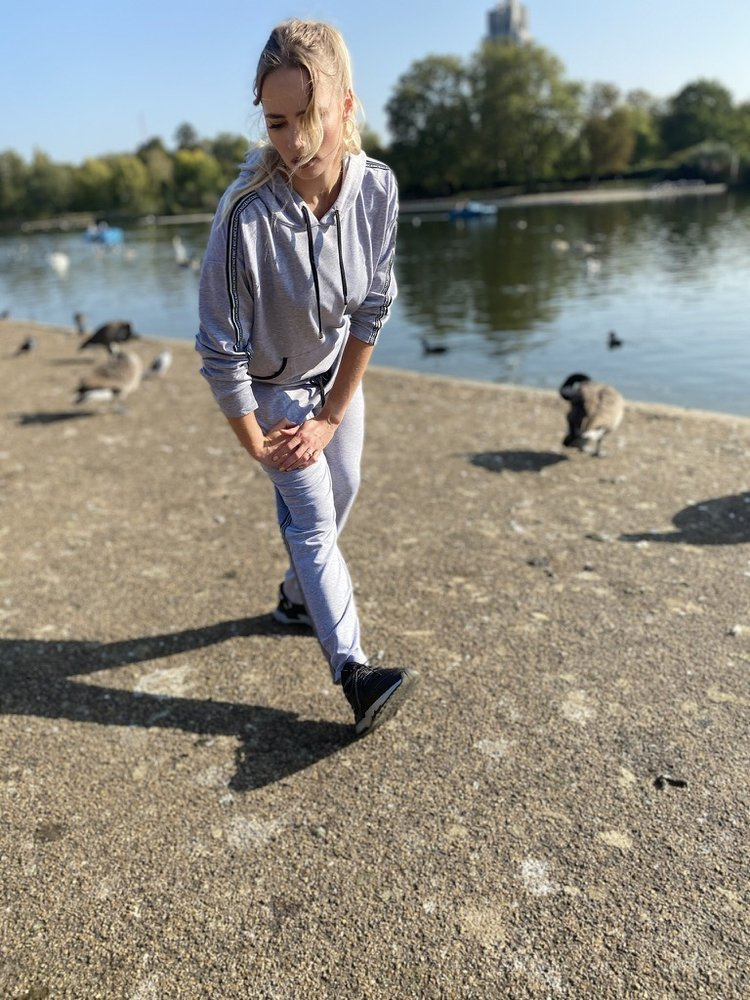 Trening confortabil pentru femei din material prietenos cu corpul. Hanorac cu glugă și mâneci lungi. La nivel abdominal, buzunar. Pantaloni cu buzunare. Cureaua se încheie cu un cordon. Mâneci și picioare împodobite cu litere.