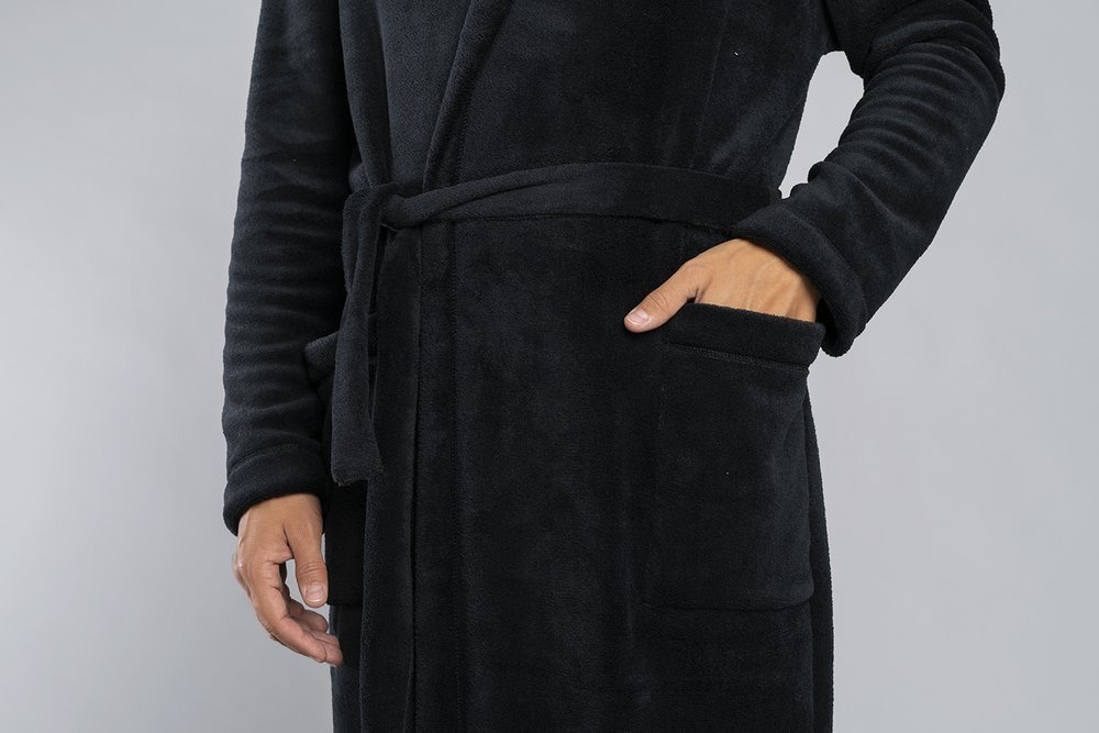 Lungă halat de baie pentru bărbați cu glugă, legat la talie.