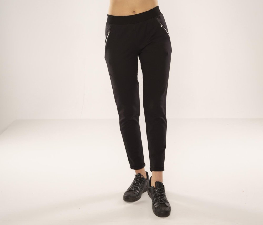Pantaloni de trening din bumbac de înaltă calitate. Talie confortabilă cu cordon. Buzunare cu fermoar la nivelul șoldurilor. Picioare ușor conice care se termină cu o manșetă mică.
