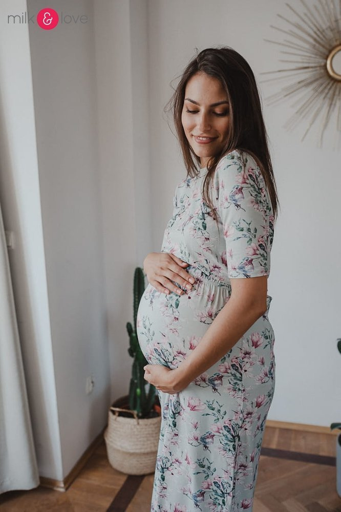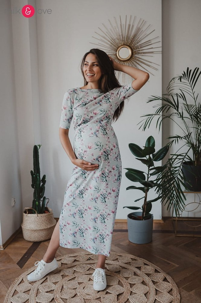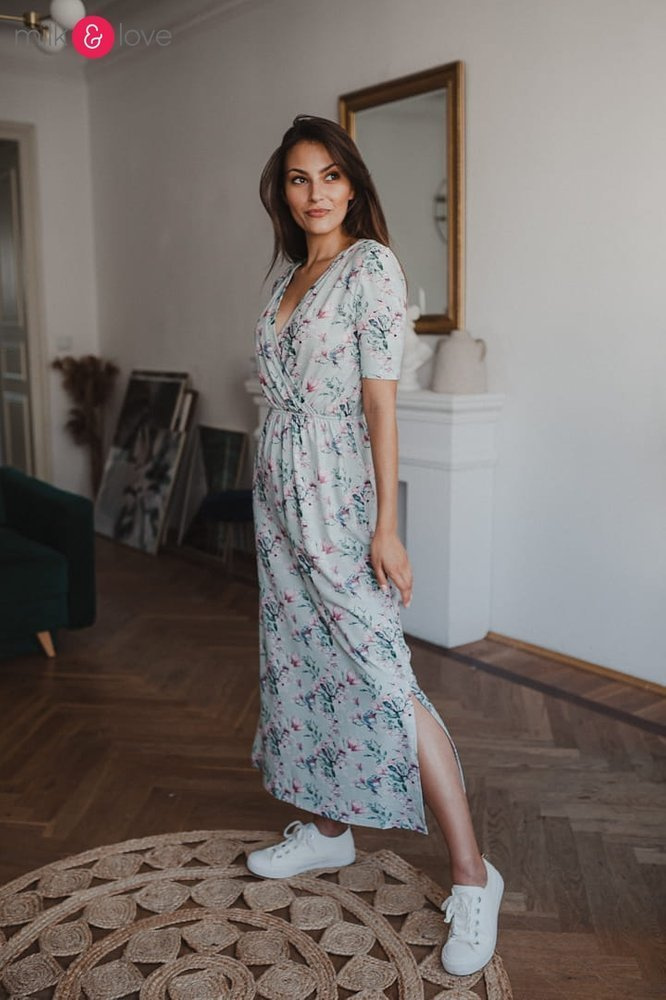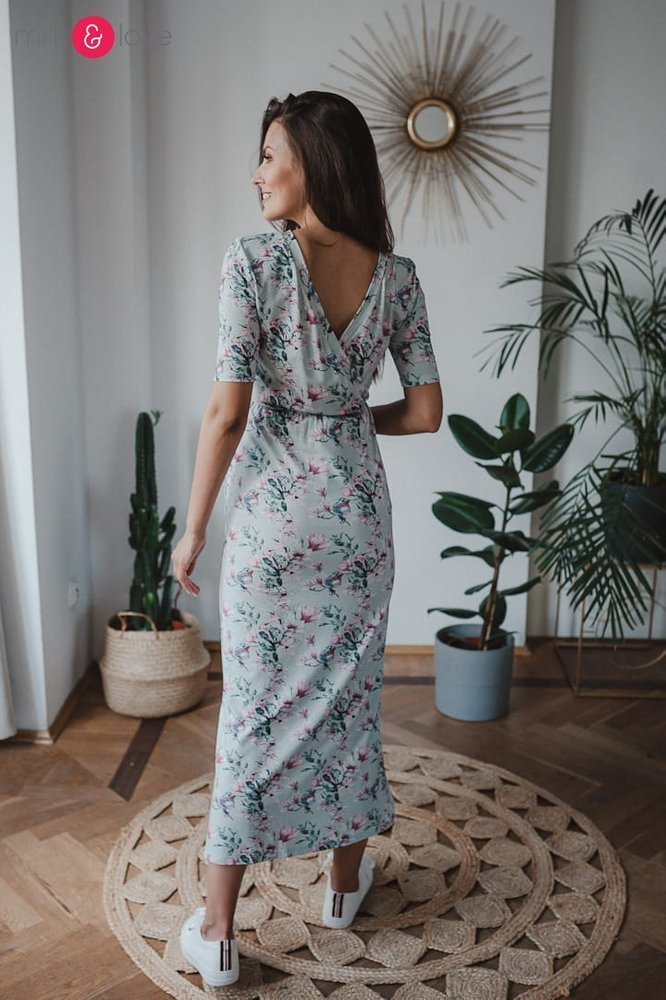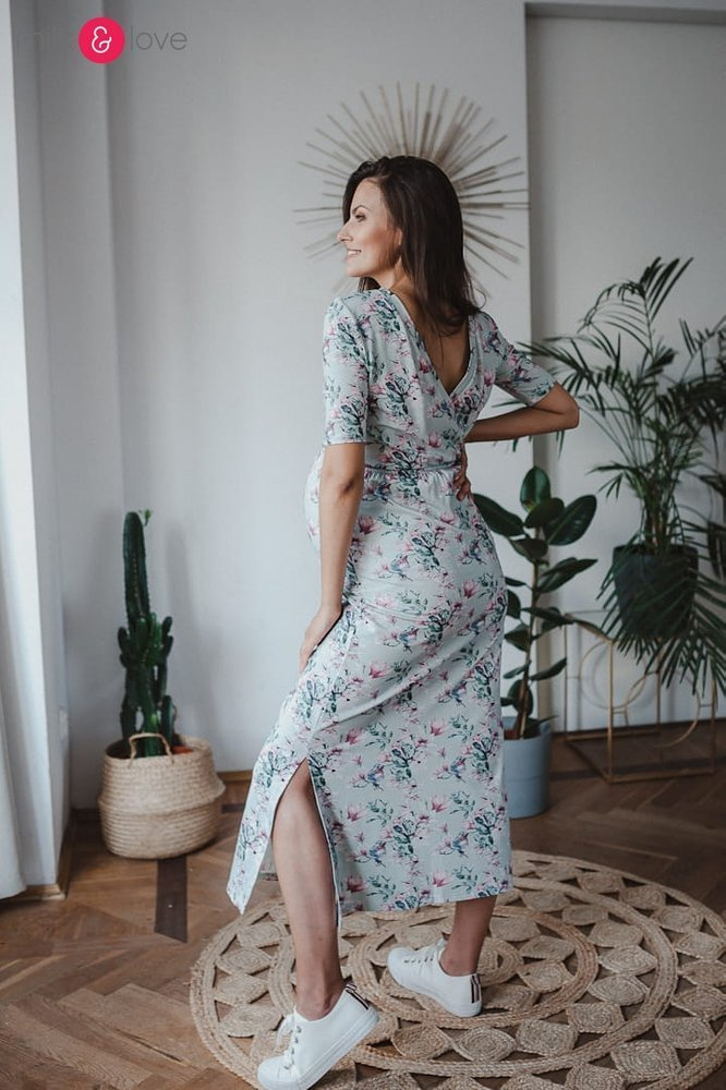 Sukienka ciążowa i do karmienia Two Ways LONG Milk&Love miętowa w magnolie i ptaki