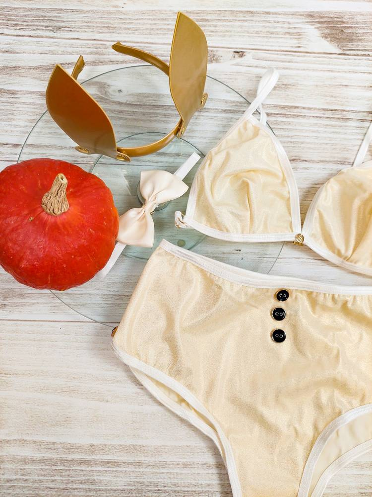 - figi z wysoką linią talii, z przodu ozdobne guziczki, z tyłu biały pomponik