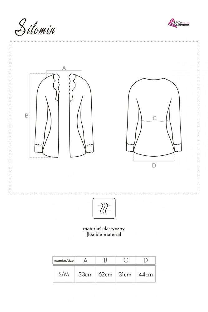Fascynujący komplet bielizny wykonany z delikatnej koronki w czarnym kolorze. Króciutki szlafrok i body na regulowanych ramiączkach. Góra i długie rękawy szlafroka udekorowane czarną koronką. Biustonosz posiada pionowe rozcięcia. Tył obszyty u dołu koronką, ponętnie odsłania plecy.