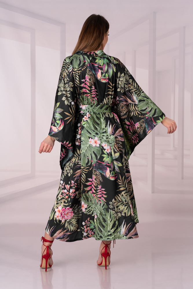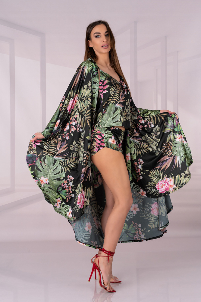 Połączenie subtelnej zmysłowości ze stylową oryginalnością. Wiązany w talii grubą szarfą szlafrok został uszyty z przewiewnej tkaniny. Miękki i miły w dotyku materiał. Czarny materiał został ozdobiony oryginalnym wzorem, przedstawiającym motywy roślinne. Brzegi tkaniny zabezpieczono przed pruciem przez podwinięcie i podszycie materiału, co pozwoliło uzyskać eleganckie wykończenie. Kopertowy krój szlafroka sprawia, że można w prosty sposób regulować głębokość dekoltu. Wygodne, szerokie rękawy nie ograniczają ruchów, co zapewnia komfort i swobodę użytkowania. Szlafrok idealnie prezentuje się na każdym typie sylwetki. Został zaprojektowany tak, by zakrywał niedoskonałości i eksponował atuty figury.