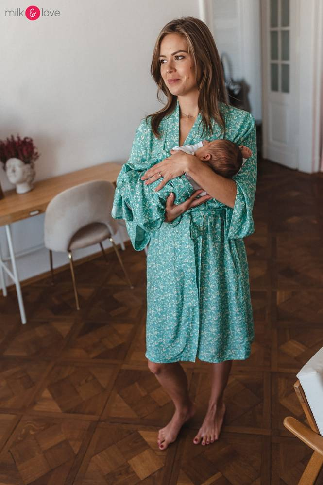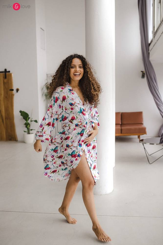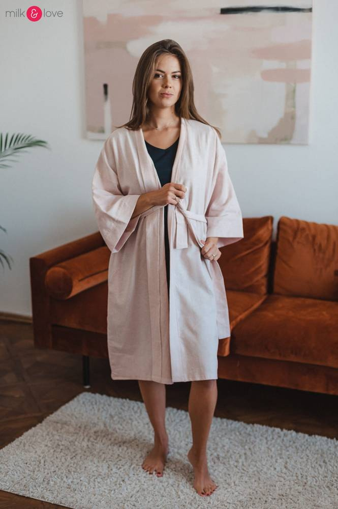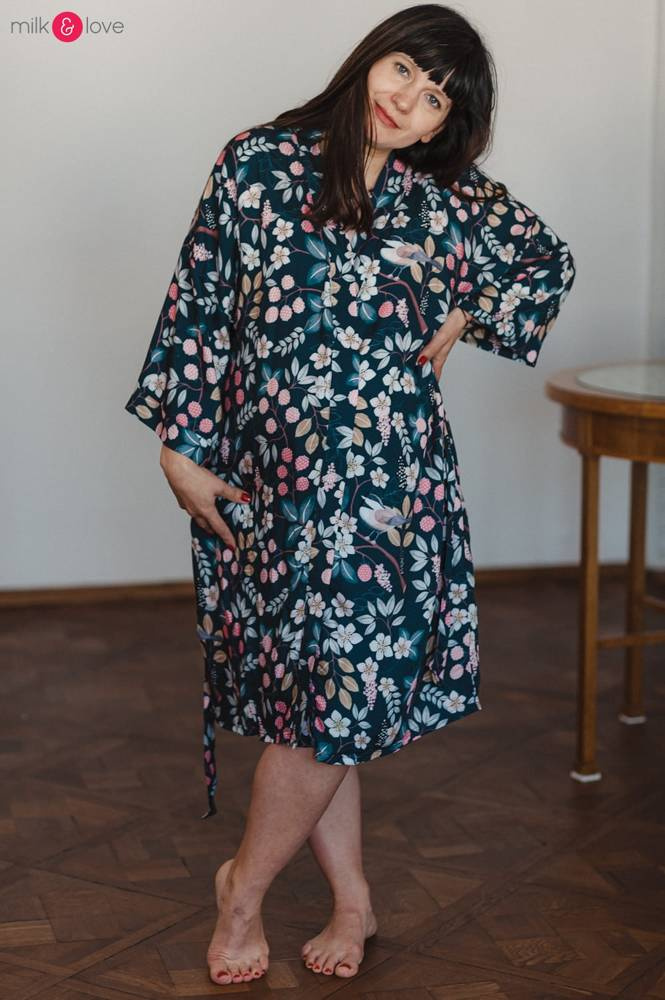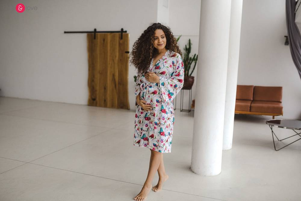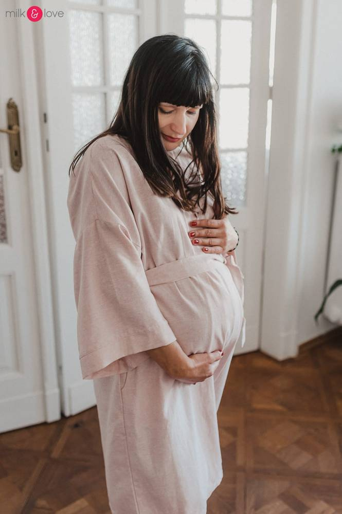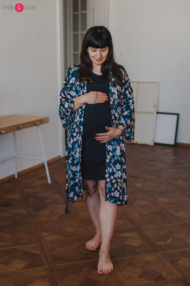 Szlafrok został zaprojektowany z myślą o mamach, dlatego jest nieco dłuższy, abyś spokojnie okryła nim ciążowy brzuszek. Po porodzie bez skrępowania b będziesz mogła spacerować po szpitalnym korytarzu lub na leżąco nakarmiła maluszka w połogu. Posiada kieszenie na niezbędne drobiazgi i pasek do regulowania szerokości.