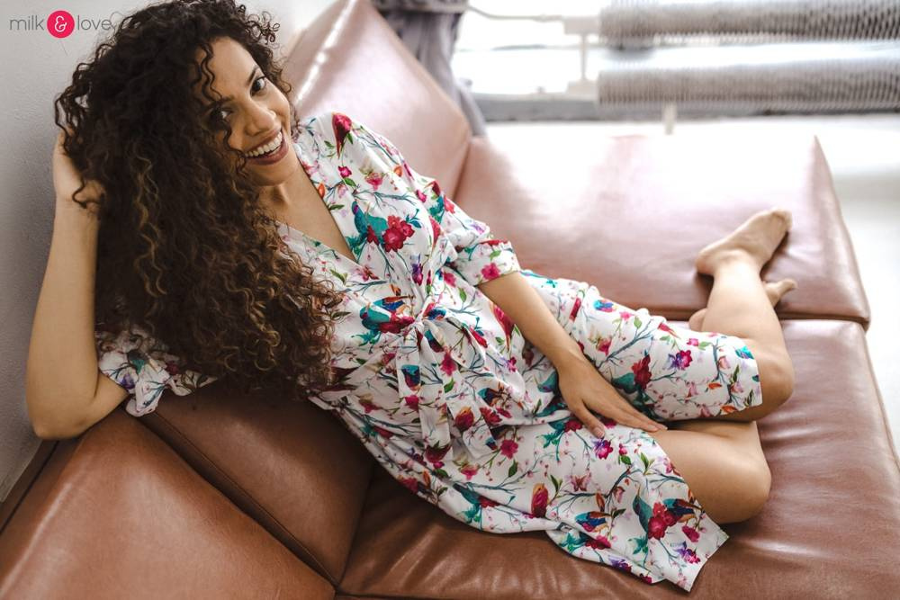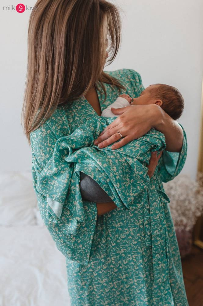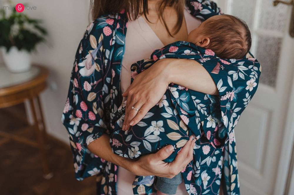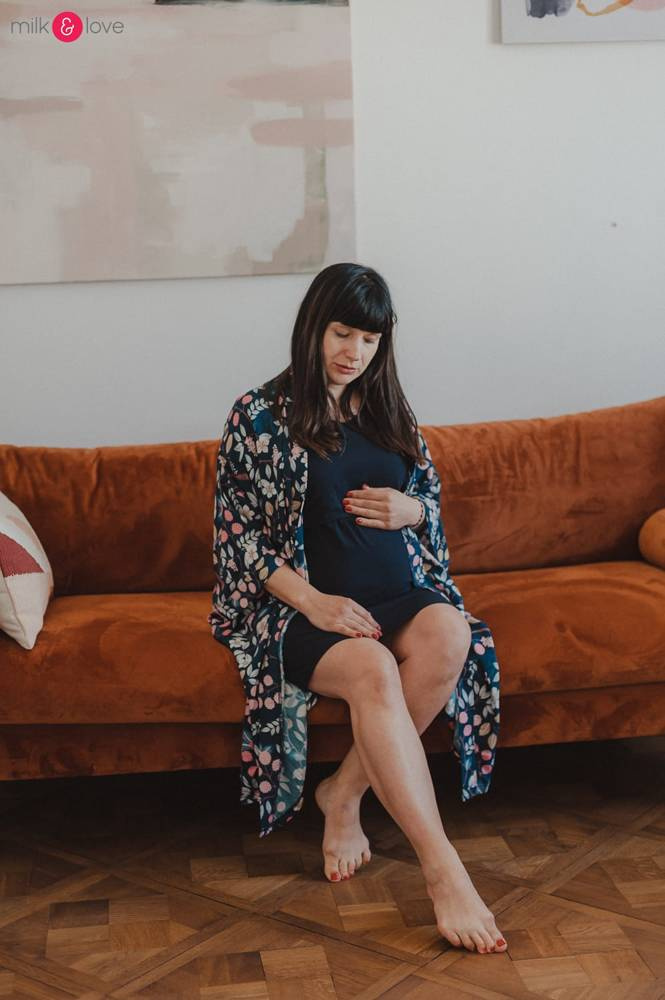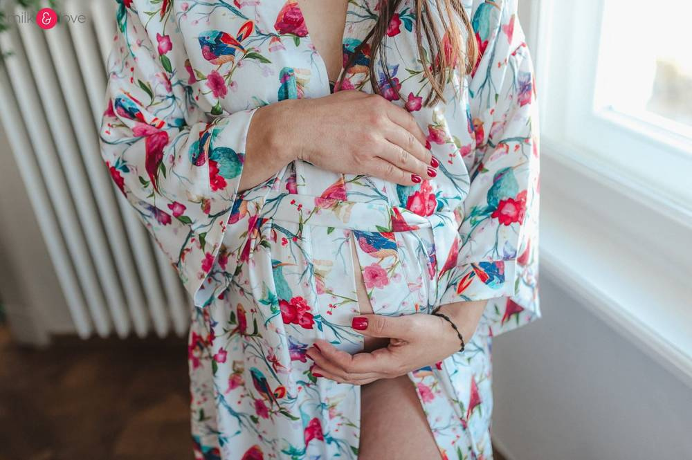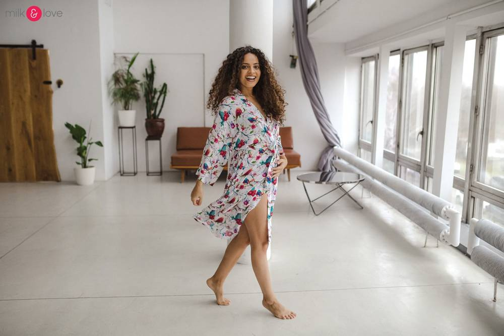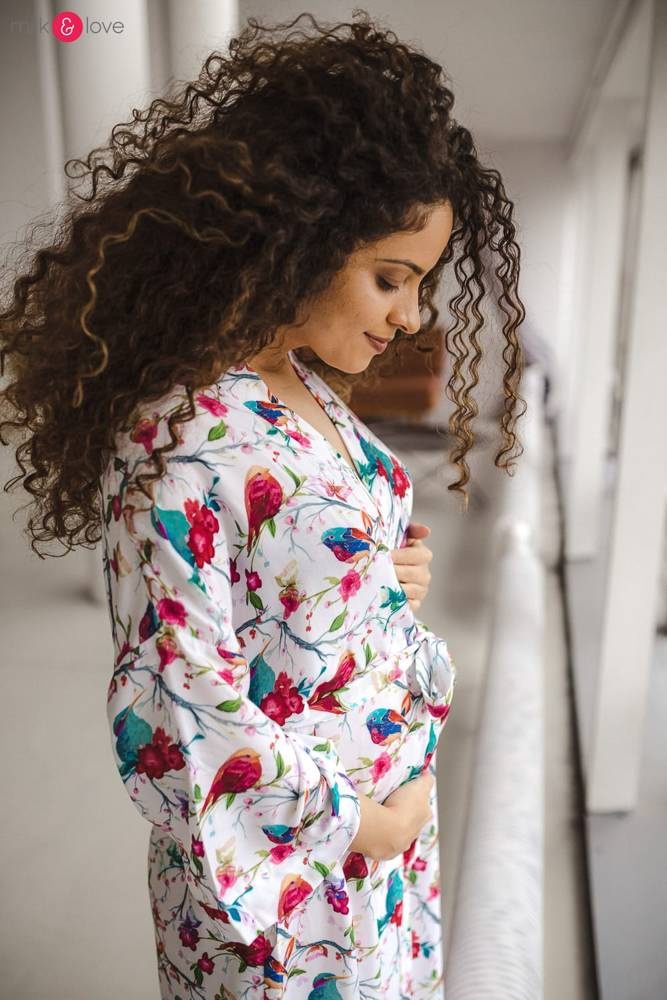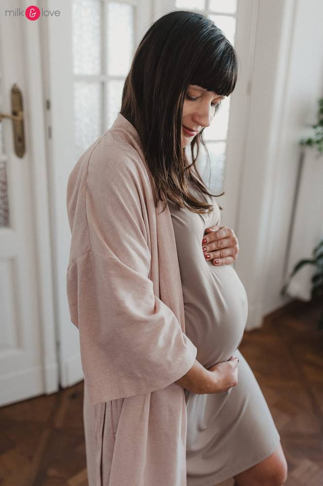 Szlafrok został zaprojektowany z myślą o mamach, dlatego jest nieco dłuższy, abyś spokojnie okryła nim ciążowy brzuszek. Po porodzie bez skrępowania b będziesz mogła spacerować po szpitalnym korytarzu lub na leżąco nakarmiła maluszka w połogu. Posiada kieszenie na niezbędne drobiazgi i pasek do regulowania szerokości.