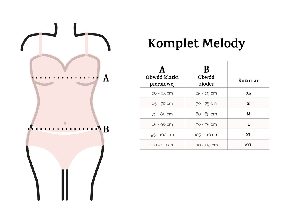 Komplety Melody to bardzo seksowna propozycja dla odważnych Kobiet. Idealny na wieczór we dwoje ale także do codziennej stylizacji. Świetnie sprawdzi się pod marynarkę czy sweter. Ten zmysłowy komplet bielizny jest idealny dla pewnej siebie kobiety, która chce czuć się seksownie i pięknie. Koronkowy top z pewnością zwróci na siebie uwagę, a prześwitujące figi będą seksownym dopełnieniem. Niezależnie od tego, czy szukasz czegoś specjalnego na romantyczny wieczór, czy chcesz poczuć się seksownie dla siebie, ten zestaw na pewno Ci się spodoba.