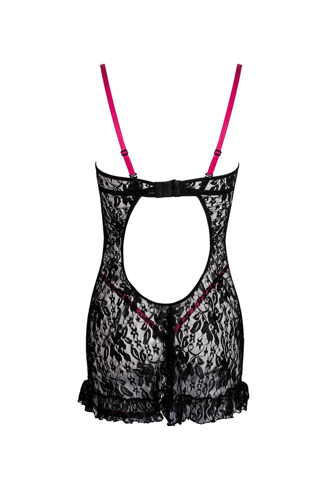 Dekolt ozdobiony efektownymi paseczkami w uroczym, różowym kolorze.
