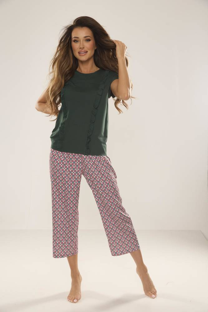 Pijama din două piese de la De lafense din viscoză de înaltă calitate. Perfect pentru un somn bun și un început de zi excelent cu prima cafea de dimineață. Tricou cu mânecă scurtă. Pantaloni scurți cu model, culottes, lungime 3/4.