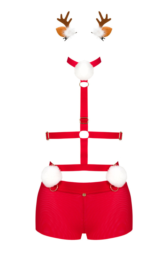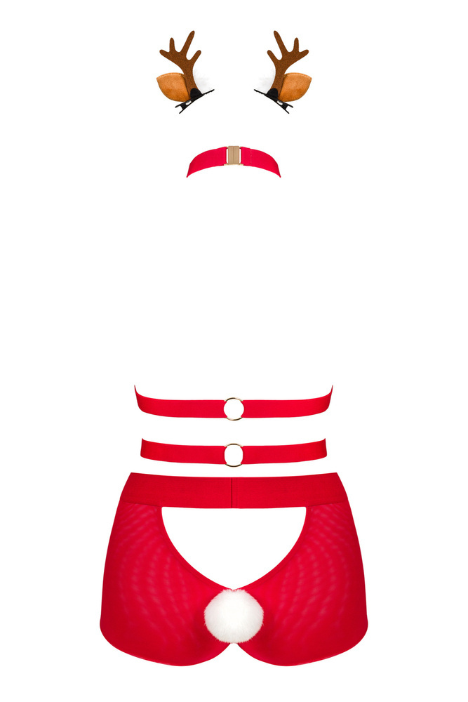Seksowny komplet, który gwarantuje pełne przyjemności chwile z ukochaną osobą. Kuszący krój i niezwykle pikantne elementy – uprząż, majtki i opaska z uszami, tworzą razem figlarną stylizację w świątecznym klimacie. Figi z kuszącym wycięciem na pośladkach, zdobione białym puszkiem