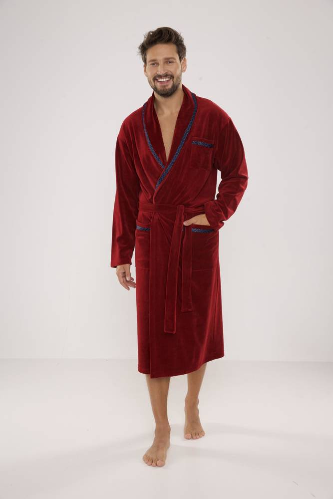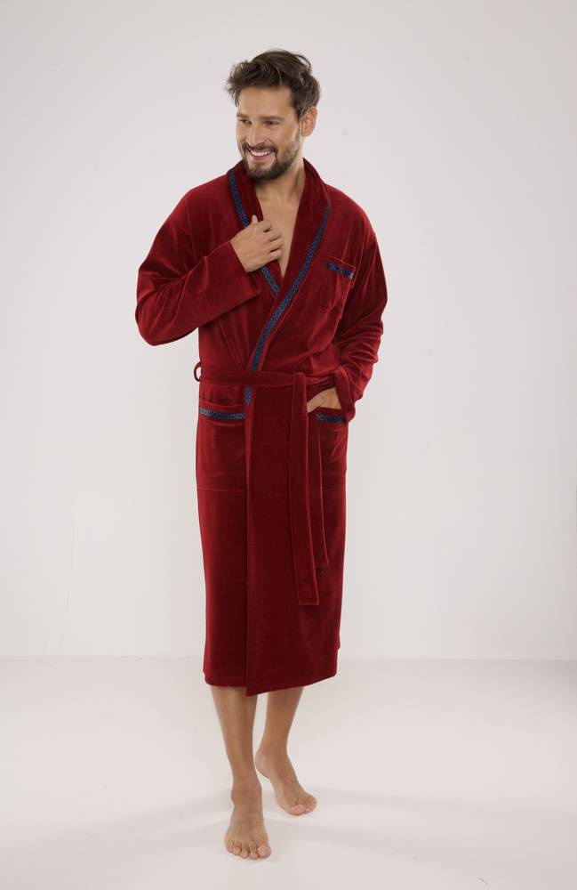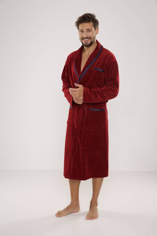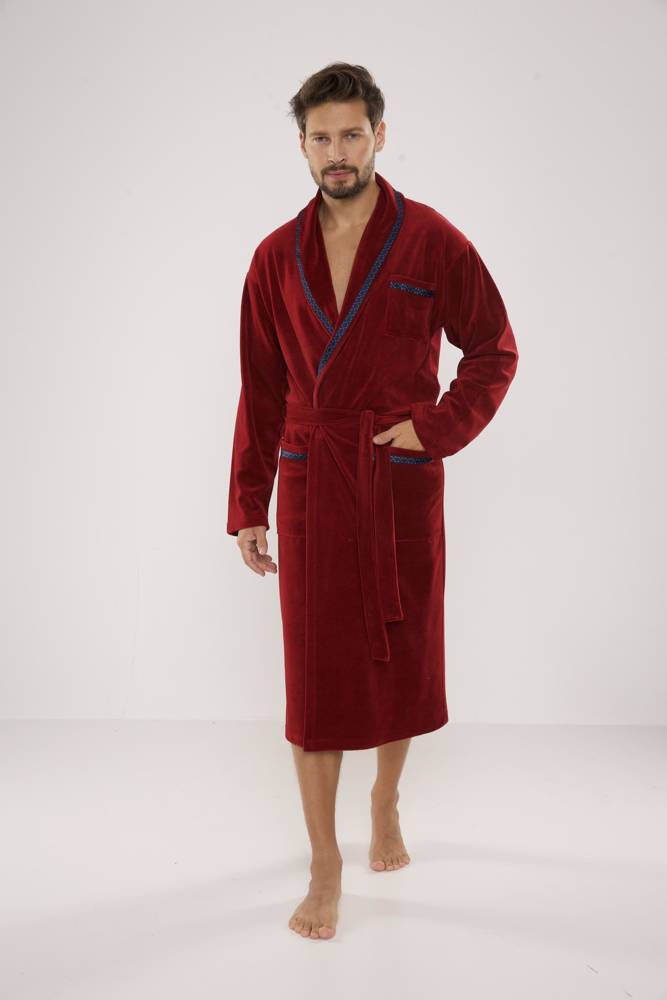 Halat de baie lung din catifea pentru bărbați. Model cu guler șal, legat în talie, cu două buzunare aplicate pe părțile laterale și unul la nivelul pieptului. Wfabricat din 80% bumbac tip velur. Material plăcută cu o atingere moale și o absorbție excelentă a apei.