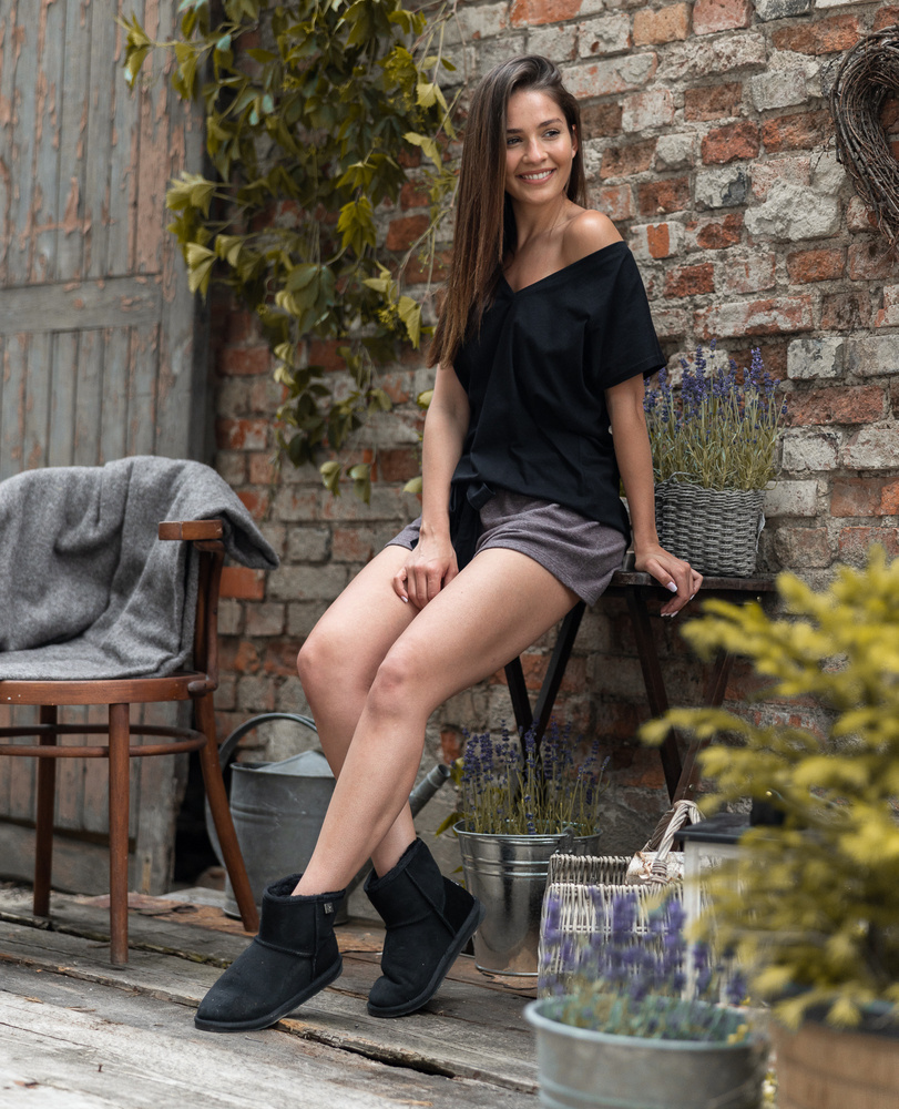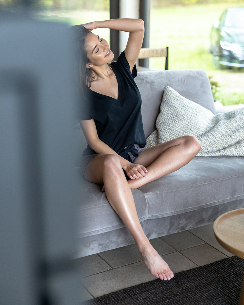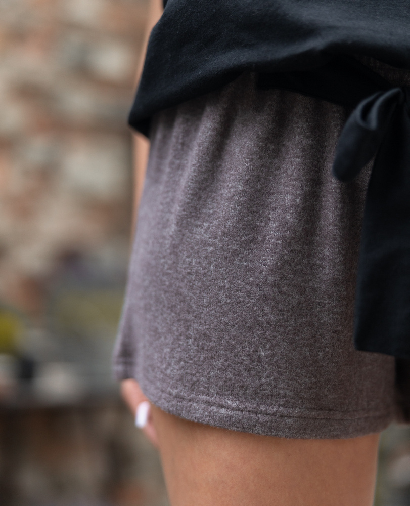 Pijamale excepționale pentru femei - confortabile și pline de farmec. Topul este o bluză din bumbac cu decolteu în V. Însoțit de pantaloni scurți drăguți Confecționat din tricot moale de viscoză. Talie elastică confortabilă și legături.