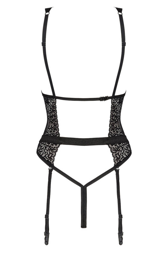 Seksowne body wykonane z delikatnie prześwitującego materiału. Koronka dodaje elegancji i szyku, a seksowne paseczki otulają seksapilem. Biustonosz z fiszbinami idealnie podtrzymuje biust. Odpinane, regulowane paski do pończoch – możliwość noszenia na wiele sposobów. Brak pończoch w zestawie.