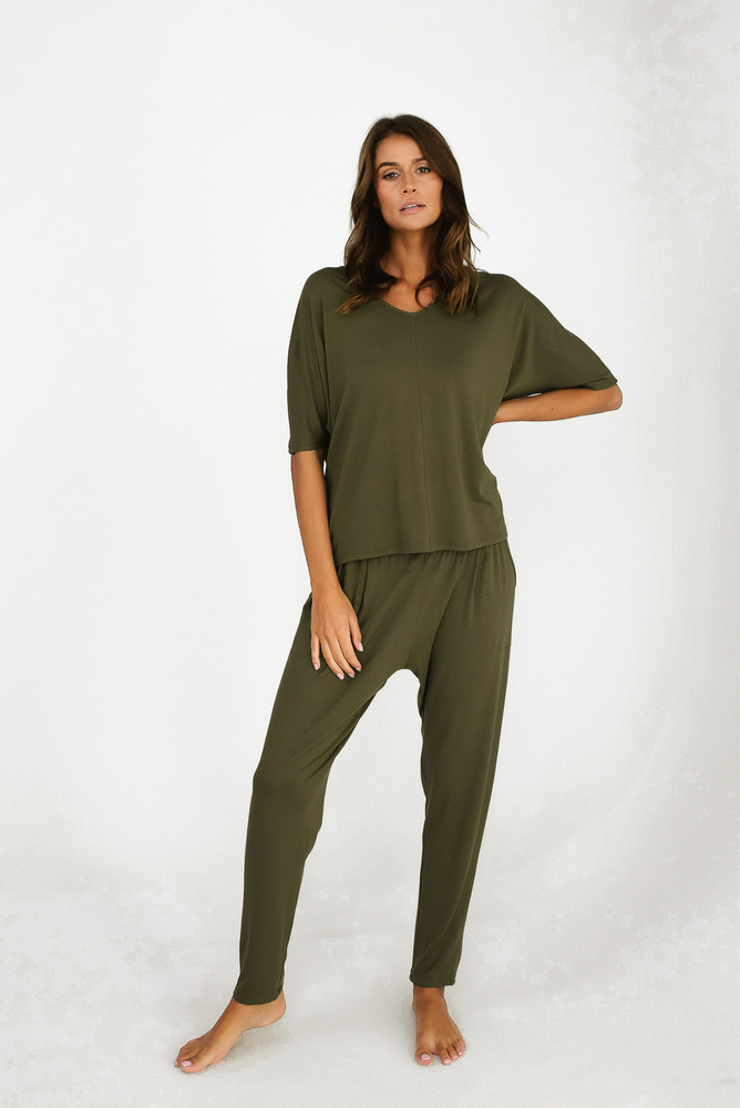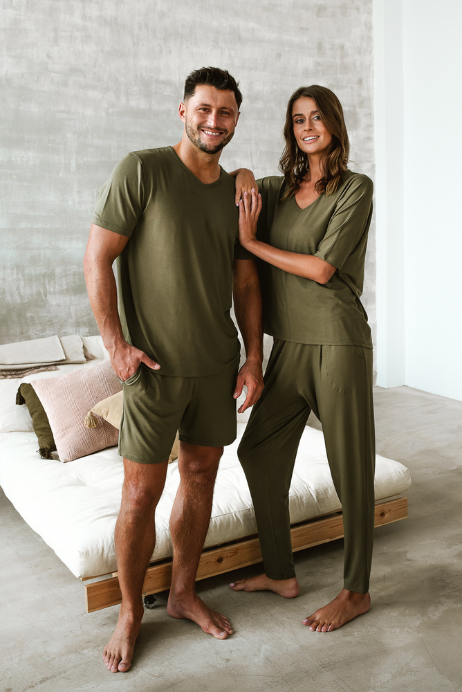 Colecția PARAMO din viscoză este perfectă pentru toate anotimpurile. Versatilitatea sa este rezultatul culorii sale kaki discrete, precum și al materialului său foarte adaptabil la diferite temperaturi. Vâscoza protejează pielea de frig, dar structura acestei țesături este respirabilă, astfel încât reglează eficient temperatura corpului. În plus, vâscoza moale și foarte plăcută la atingere oferă un confort extraordinar în timpul somnului, care este obținut în continuare prin elasticul non-presiune din pantaloni și croiala largă. Farmecul setului este adăugat de tăietura originală și ușor pretențioasă. Este alegerea ideală pentru cei care acordă prioritate confortului cu clasă.