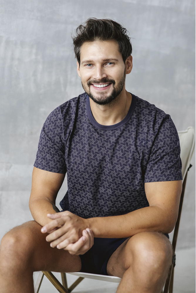 Extrem de plăcută pentru piele datorită utilizării tricotajelor din bumbac, care oferă un nivel ridicat de confort. Tăietura clasică va fi foarte confortabilă pentru orice bărbat. Pijamalele au buzunare practice în pantaloni. Topul cu model și pantalonii scurți albastru marin alcătuiesc un set frumos, clasic.