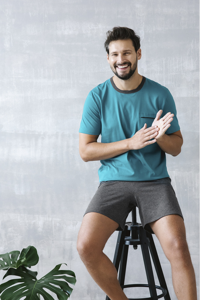 Extrem de plăcută pentru piele datorită utilizării tricotajelor din bumbac, care oferă un nivel ridicat de confort. Tăietura clasică va fi foarte confortabilă pentru orice bărbat. Topul albastru marin și pantalonii scurți cu model alcătuiesc un set frumos, clasic.