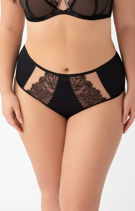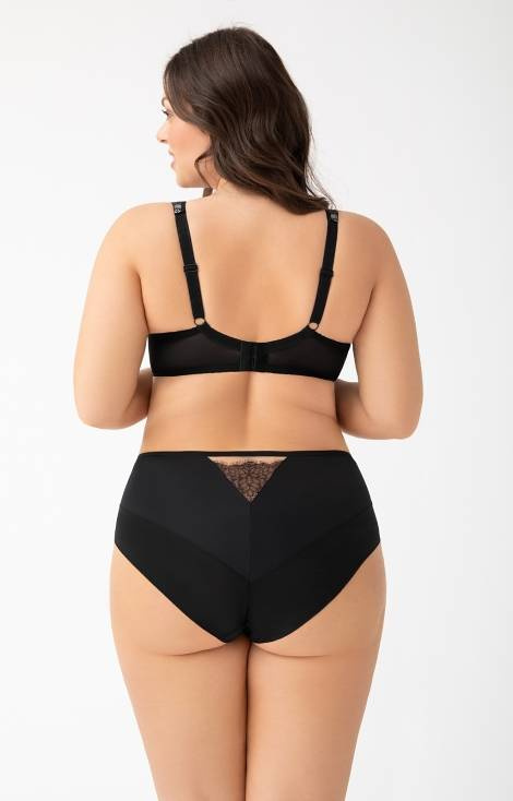 Mediu, acoperă aproape toate fesele. Partea din față din microfibră cu tul și dantelă, părțile laterale din microfibră, picioare finisate cu o bandă elastică îngustă. Talie finisată cu o bandă elastică mai largă.