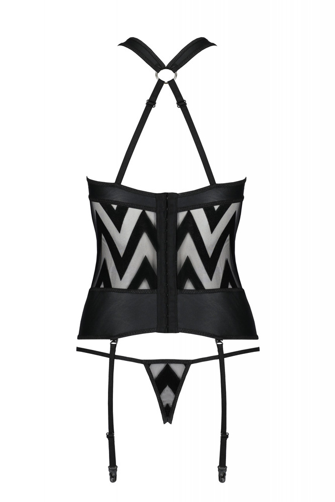 Ponadczasowa skóra i flok to oryginalne połączenie, które ozdabiają łączenia w kształcie kółek. Dodaj do tego ulubione pończochy i voila! Klasyczne wydanie gorsetu w erotycznym charakterze!