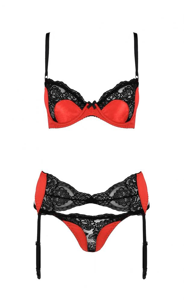 Trzyczęściowy komplet wykonany z elastycznej satyny oraz delikatnej koronki.