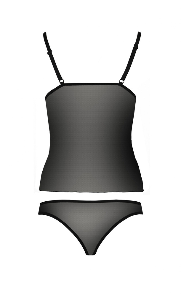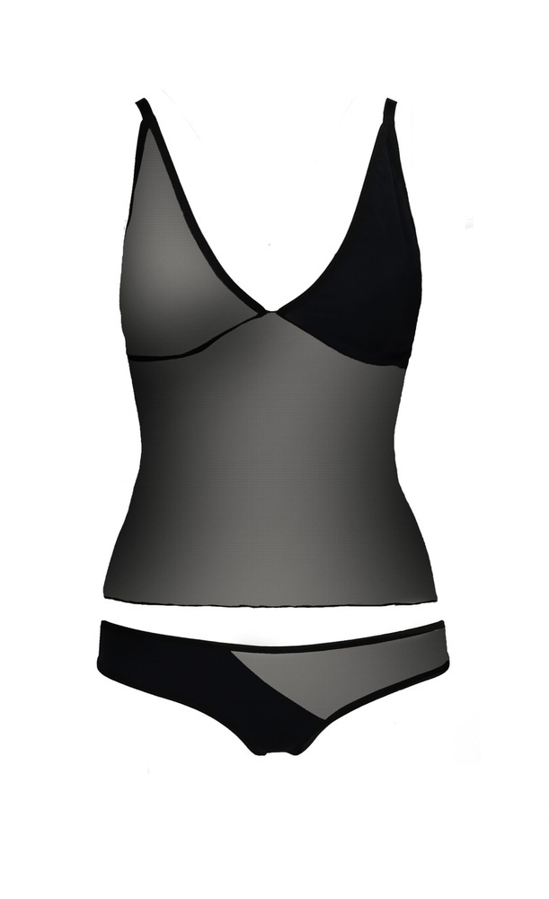 Komplet wykonany z delikatnej mikrofibry oraz elastycznego tiulu. Stringi w komplecie. Guma ramiączkowa jak przy stanikach. Regulowane ramiączka.