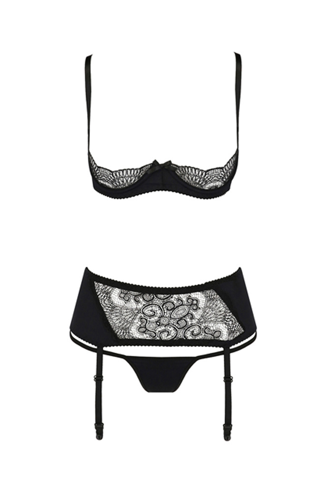 Alina set jest kompletem dla odważnych, pewnych siebie kobiet. Biustonosz typu "open bra", czyli z otwartą częścią biustonosza, to model, który pobudza wyobraźnie w każdym tego słowa znaczeniu. Dopasowujący się do ciała pas do pończoch idealnie ukazuje jego walory. Wiązanie z tyłu pasa dodaje mu oryginalności, jednocześnie tworząc idealnie współgrający element z biustonoszem. Efekt? Elegancja wypełniona do granic seksapilem.
