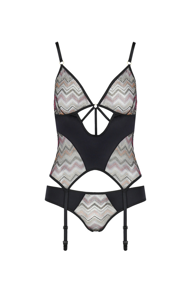 Gorset Lagerta sprawdzi się idealnie dla kobiet lubiących połączenie bielizny z symetrycznym, fantazyjnym wzorem, nietypowym krojem i ciekawą kolorystyką. Odpowiednio skrojone materiały i głęboki dekolt eksponują kobiece walory oraz nadają sylwetce pożądany, smukły kształt.