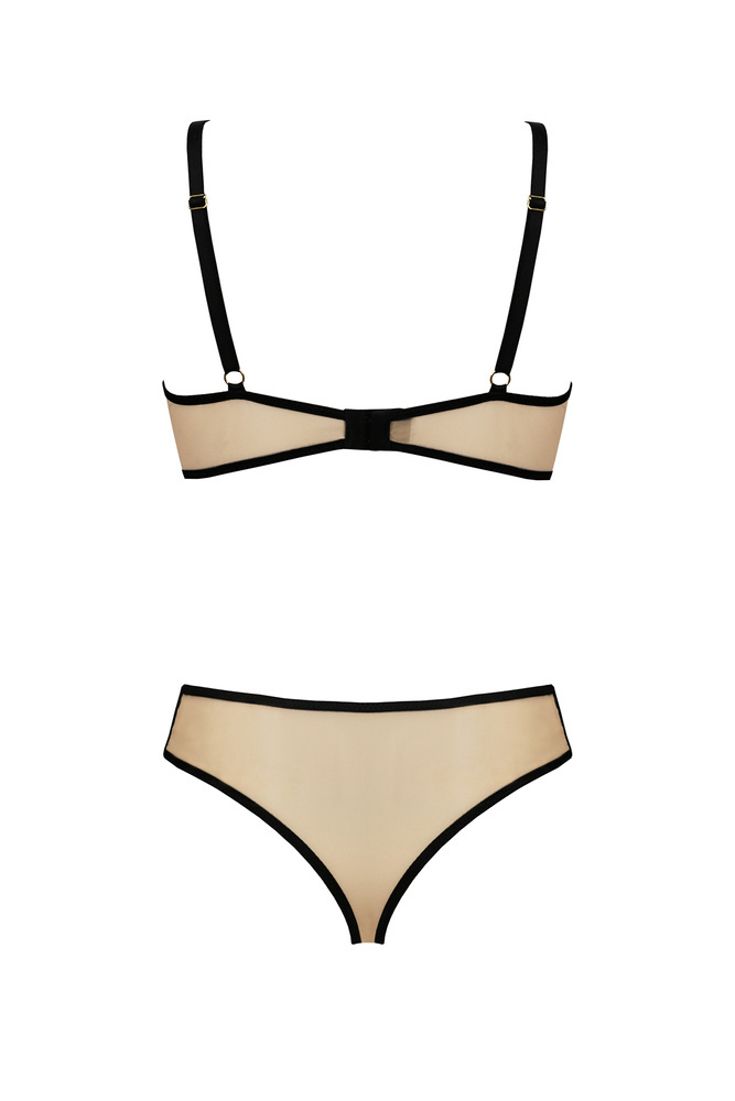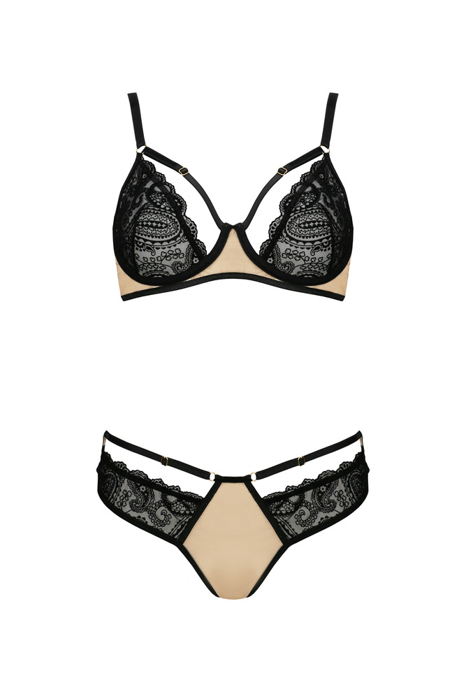 Fantazyjna koronka oraz zmysłowe paski opinające biust to elementy, które składają się na nieco frywolny i zdecydowanie perwersyjny charakter kompletu Daisy. Wysokiej jakości materiał sprawia, że model sprawdzi się idealnie dla odważnych, pewnych siebie kobiet, które cenią sobie zarówno wysoką jakość, wygodę jak i nietypowe rozwiązania w garderobie.