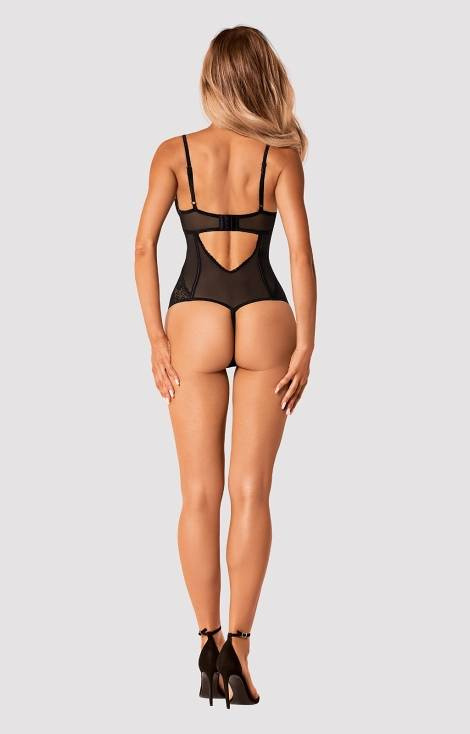 Body damskie wykonane z elastycznej siateczki w połączeniu z koronką. Miseczki miękkie, na fiszbinach. Ramiączka posiadają regulację. Otwarty krok.