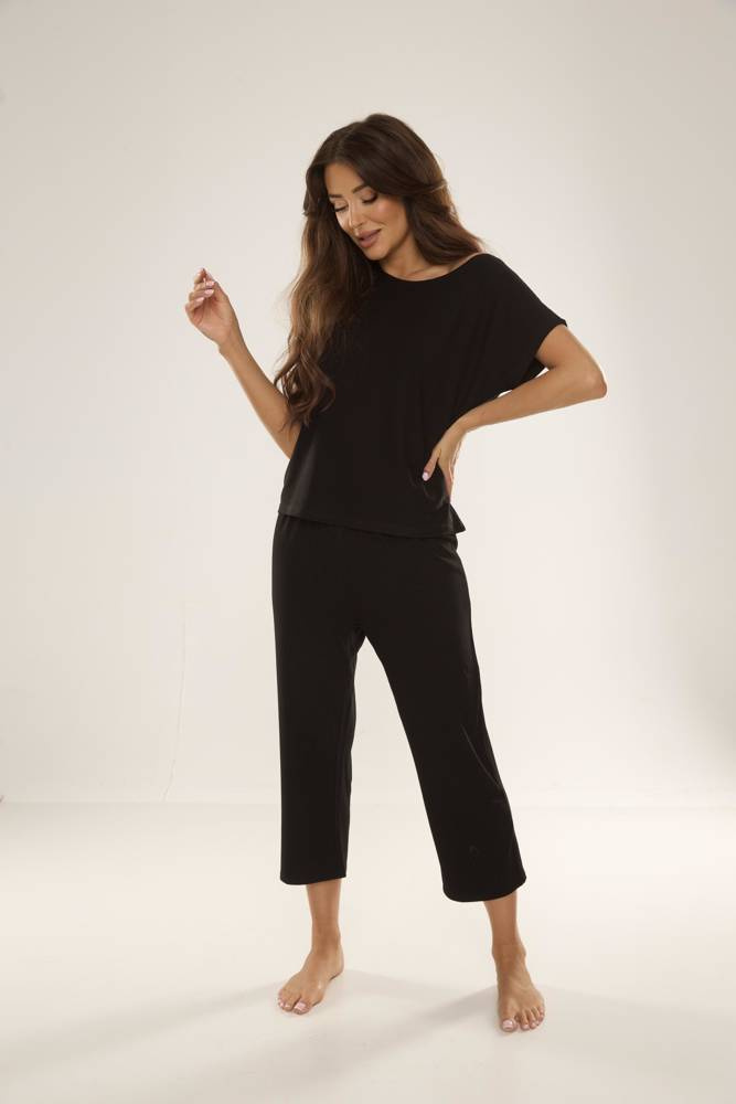 Pijama din două piese de la De lafense din viscoză de înaltă calitate. Perfect pentru un somn bun și un început de zi excelent cu prima cafea de dimineață. Slabă ktricou cu mânecă scurtă. Pantaloni solizi, lungime 7/8. Pijamalele vor funcționa bine ca îmbrăcăminte confortabilă de casă.