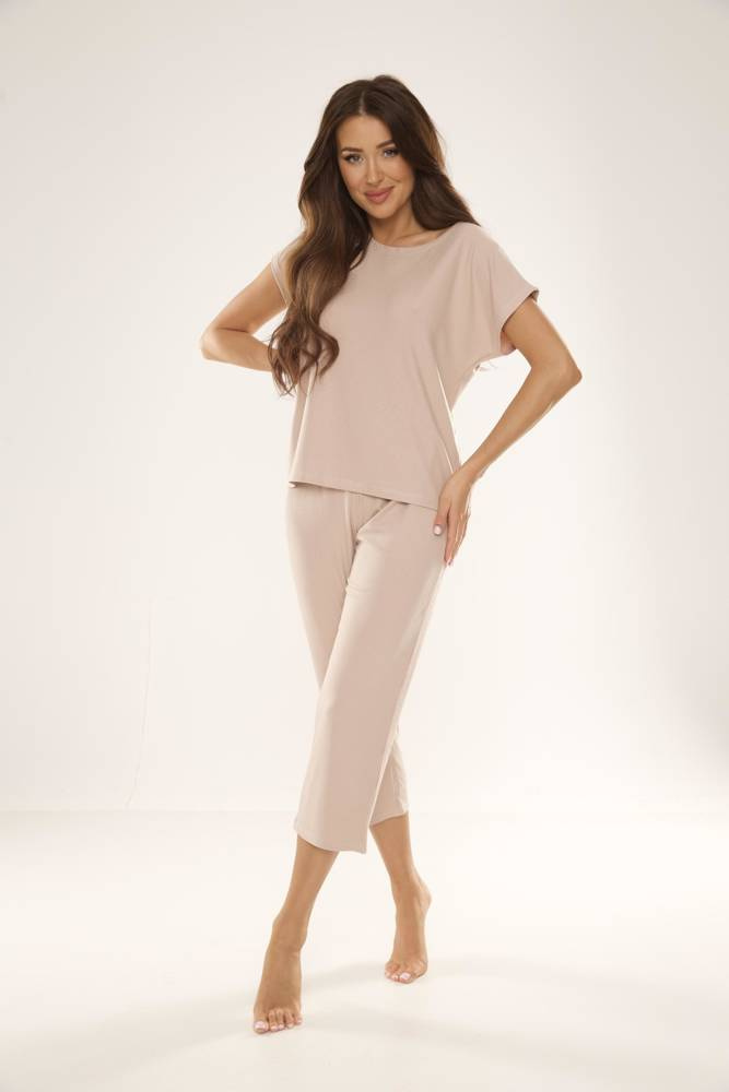 Pijama din două piese de la De lafense din viscoză de înaltă calitate. Perfect pentru un somn bun și un început de zi excelent cu prima cafea de dimineață. Slabă ktricou cu mânecă scurtă. Pantaloni solizi, lungime 7/8. Pijamalele vor funcționa bine ca îmbrăcăminte confortabilă de casă.