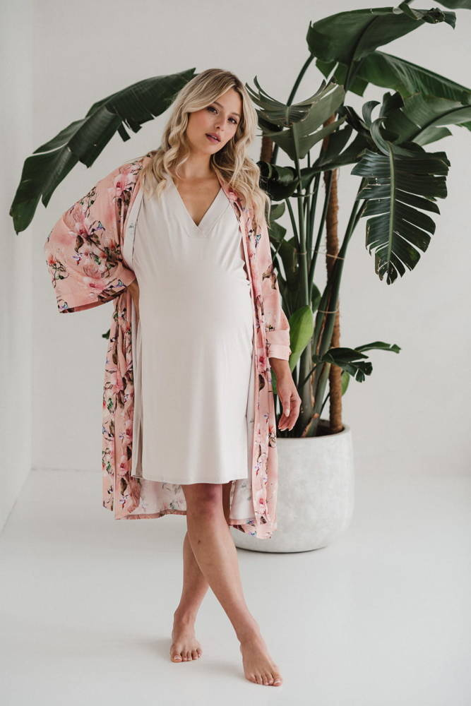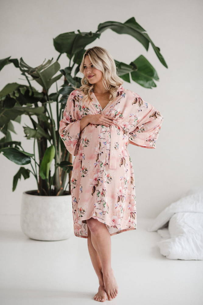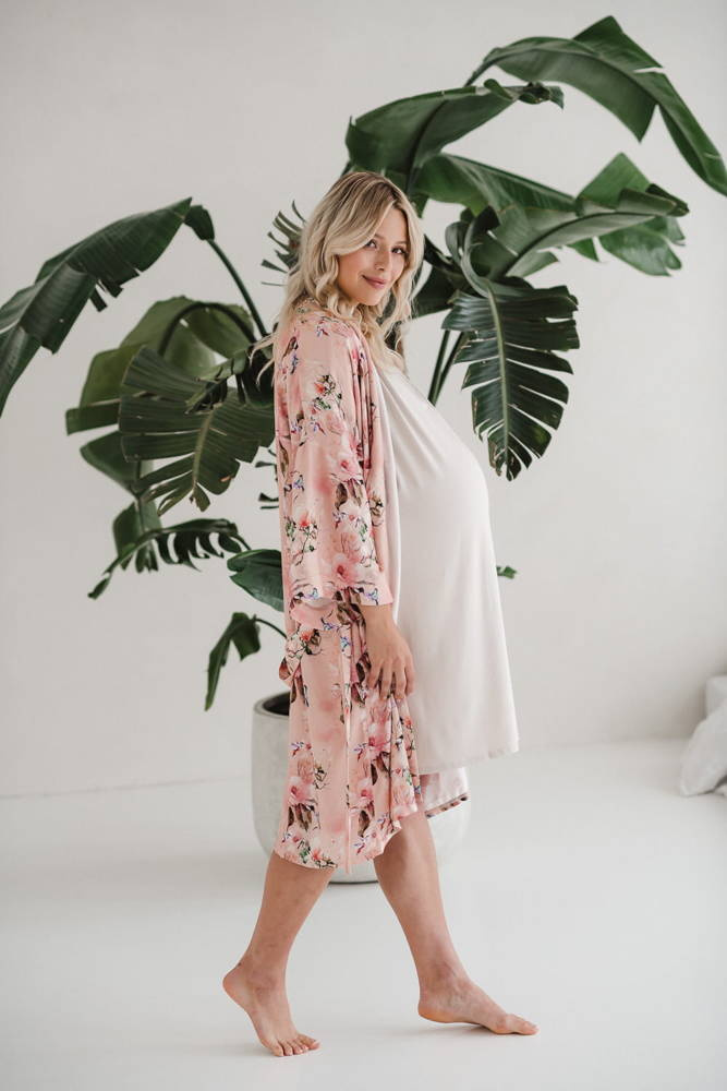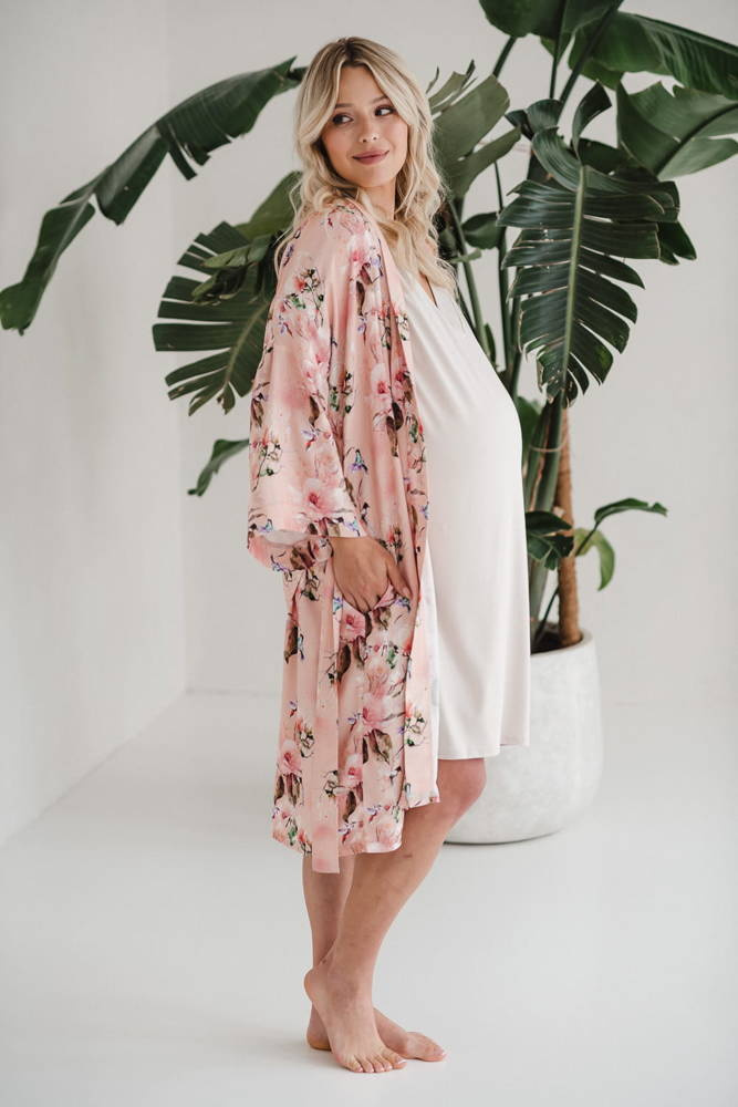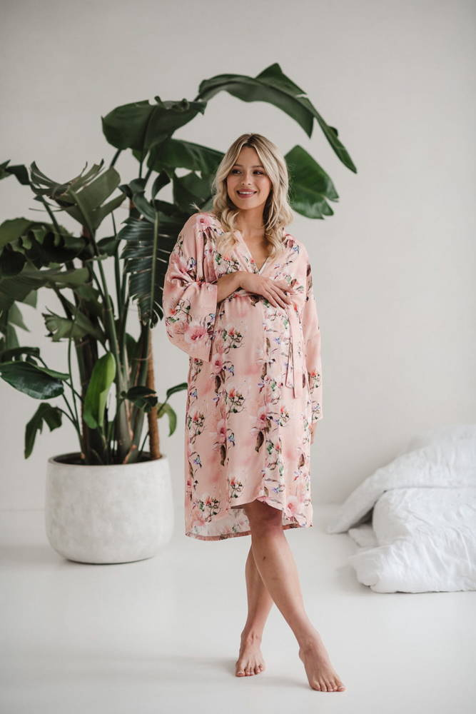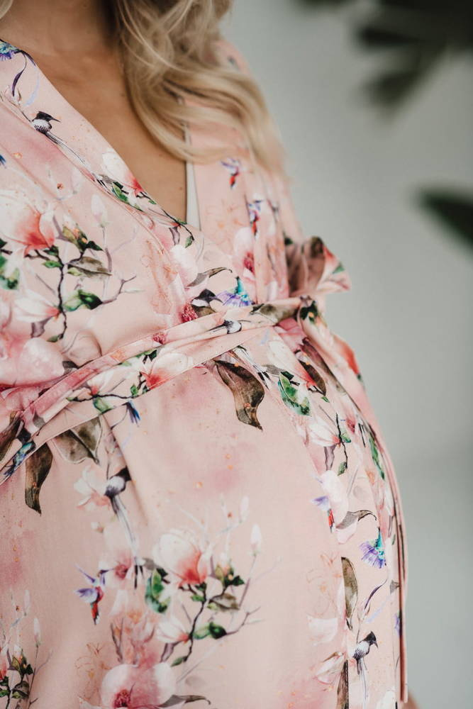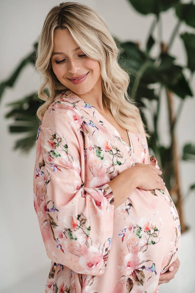 Szlafrok został zaprojektowany z myślą o mamach, dlatego jest nieco dłuższy, abyś spokojnie okryła nim ciążowy brzuszek. Po porodzie bez skrępowania b będziesz mogła spacerować po szpitalnym korytarzu lub na leżąco nakarmiła maluszka w połogu. Posiada kieszenie na niezbędne drobiazgi i pasek do regulowania szerokości.