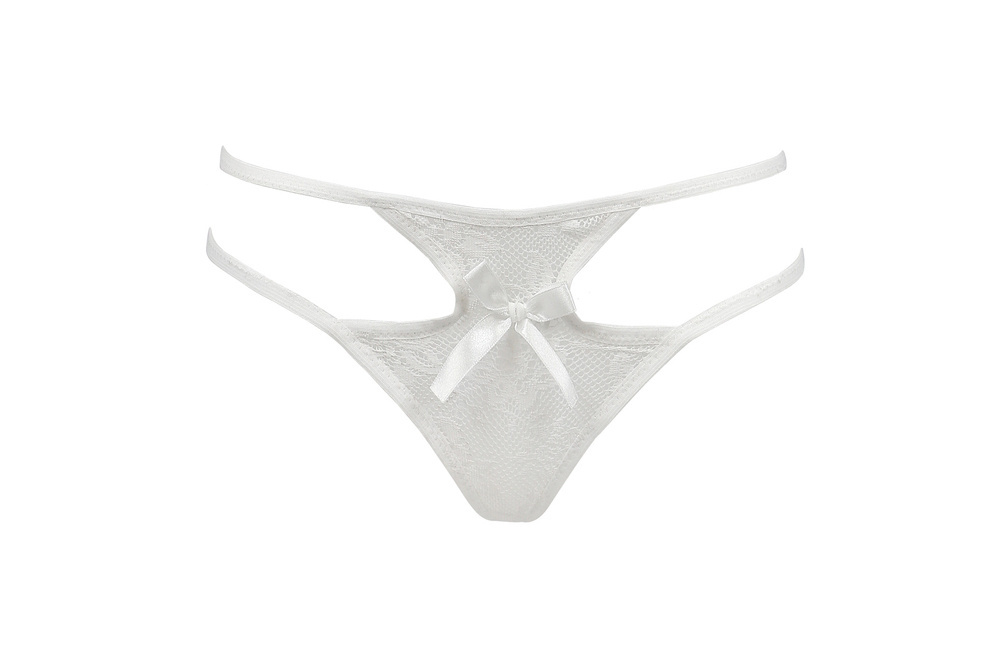 Seksowne stringi z prześwitującej koronki. Na środku ozdobna kokardka.