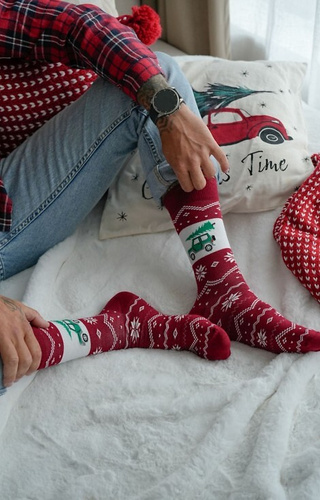 1290-030 Șosete de Crăciun pentru bărbați Milena, vișinie 01 - Mașină cu brad de Crăciun, bumbac