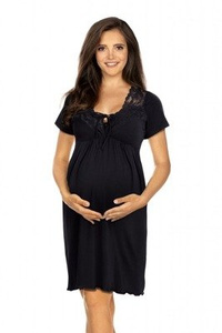 Cămașă de noapte Senizo pentru gravide nr. 37, neagră – 100% bumbac, dantelă, mâneci scurte, pentru alăptare