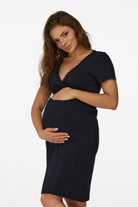 Cămașă de noapte Senizo pentru gravide nr. 37, neagră – 100% bumbac, dantelă, mâneci scurte, pentru alăptare