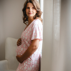 Cămașă de noapte Senizo pentru gravide nr. 14, roz – 100% bumbac, mâneci scurte, capse pentru alăptare