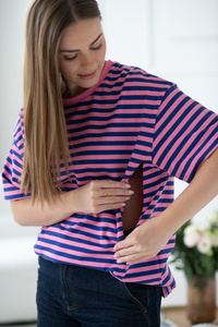 Tricou pentru maternitate și alăptare Mamahood Milk&Love, dungi roz și albastre - confortabil și elegant